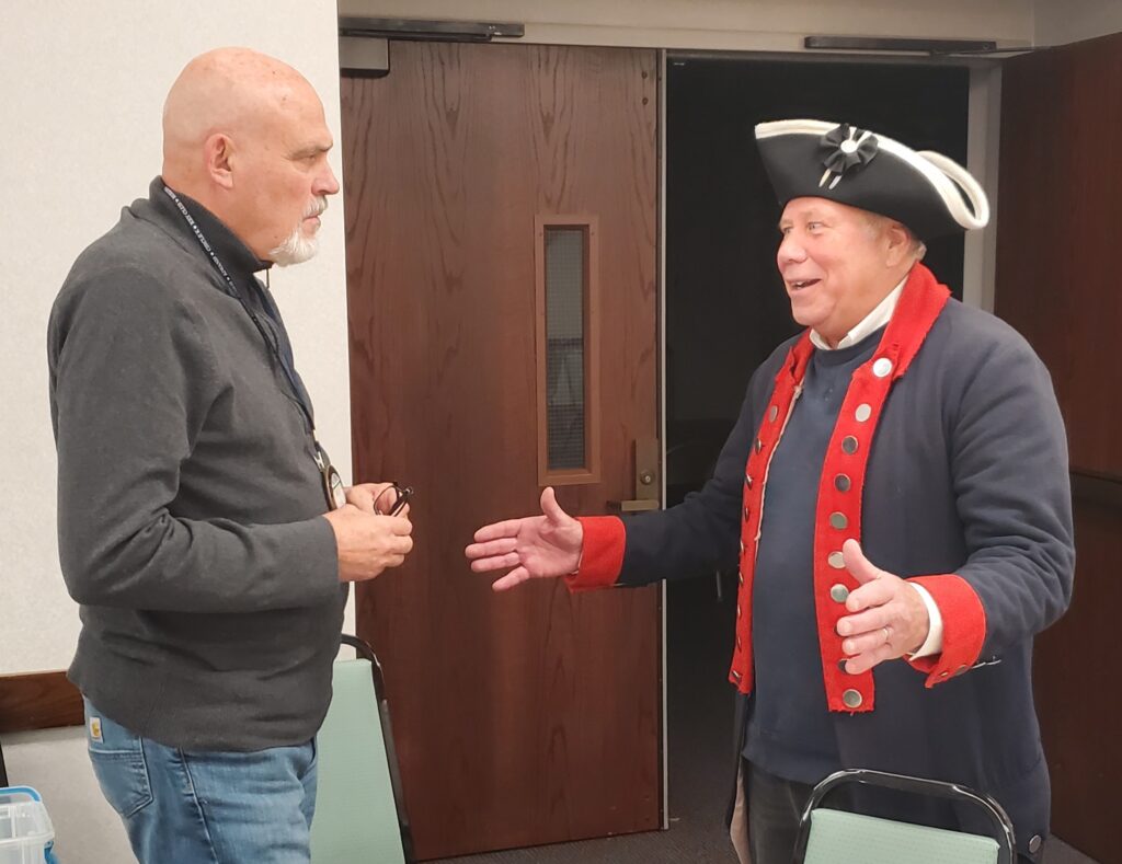 Mike Rowley, right, talks with Golden K member Matt Culp after Rowley’s presentation about Woodland Cemetery in Des Moines Thursday, November 13.Notable internments include Iowa governors Albert Cummins and Samuel Merrill; Iowa Supreme Court Justice Chester Cole; Mayors John MacVicar and Summer Spofford; banker Hoyt Sherman; politician Henry C. Wallace; businessman Frederick Hubbell; Ida Cummins, women’s and children’s rights activist; Annie Nowlin Savery, women’s suffrage activist and philanthropist; and Calista Halsey Patchin, the first woman reporter for the Washington Post.